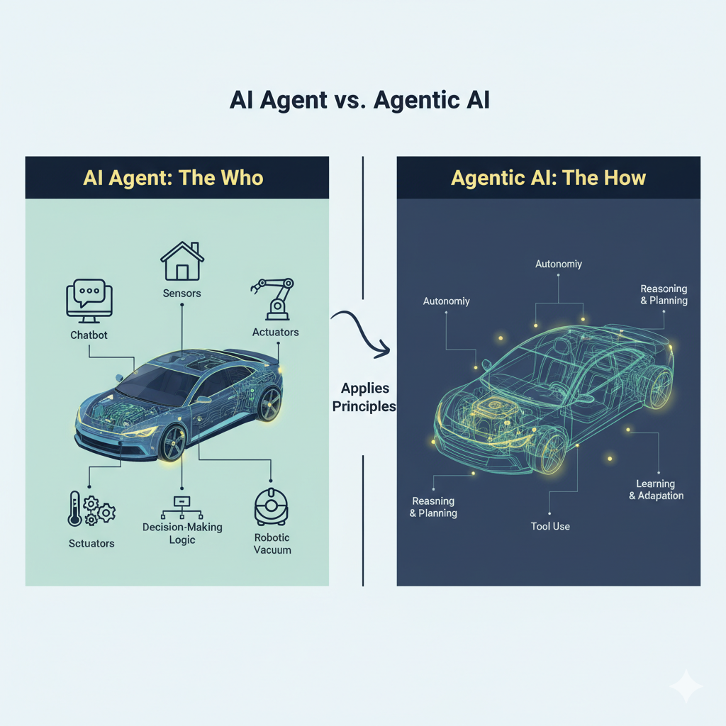An excellent analogy is the difference between a car and automotive engineering. An AI agent is like a car—a specific object you can interact with that performs a function. Agentic AI is like the field of automotive engineering—the set of principles, knowledge, and design patterns used to build effective cars.